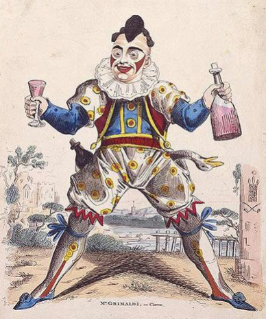 But because Grimaldi was such a star, the character he’d invented became closely associated with him. And Grimaldi’s real life was anything but comedy—he’d grown up with a tyrant of a stage father; he was prone to bouts of depression; his first wife died during childbirth; his son was an alcoholic clown who’d drank himself to death by age 31; and Grimaldi’s physical gyrations, the leaps and tumbles and violent slapstick that had made him famous, left him in constant pain and prematurely disabled. As Grimaldi himself joked, “I am GRIM ALL DAY, but I make you laugh at night.” That Grimaldi could make a joke about it highlights how well known his tragic real life was to his audiences.